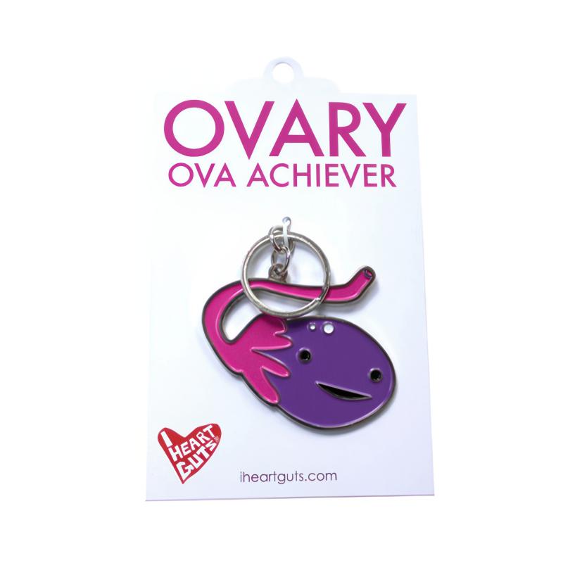 Gonad girl power graces this fab ovary keychain. The engraved back of the keychain and cardboard display both say: "Ovary: Ova Achiever." Zinc alloy with soft enamel, polybagged. Ovary part of keychain measures 2" x 1.73". Designed in the US, made in China
