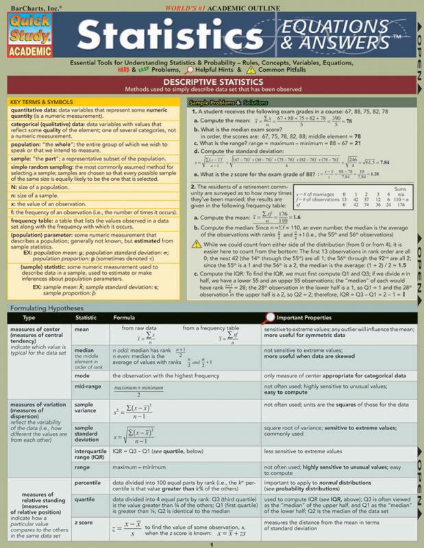 Statistics problems can make the best students shudder as they near the classroom, but they need not worry any longer-QuickStudy is here to help! A comprehensive, up-to-date collection of tips and tricks for understanding statistics/probability is contained in this 3-panel (6-page) guide, which is designed with easy-to-use icons to help students go right to the equations and problems they most need to learn, and also call out helpful tips to use and common pitfalls to avoid.