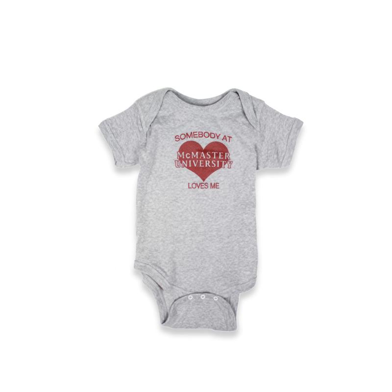 McMaster University Somebody Loves Me onesie in light grey with maroon logo. 100% cotton