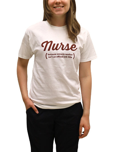 White short sleeved tshirt with Nurse Miracle worker logo in maroon. 100% cotton