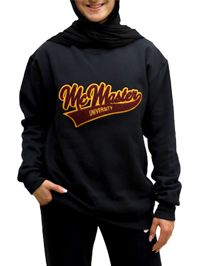 Black crewneck sweatshirt 50% cotton, 50% polyester with McMaster in maroon chenille and gold embroidered outline