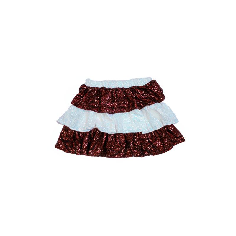 Sequin Mini Skirt- maroon and white irridescent layers. Shorts liner sewn in! Self: 100% Polyester Lining: 100% Polyester