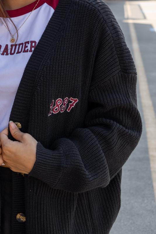 Black knitted button down cardigan with two front pockets. 1887 embroidered left chest in maroon and white thread.